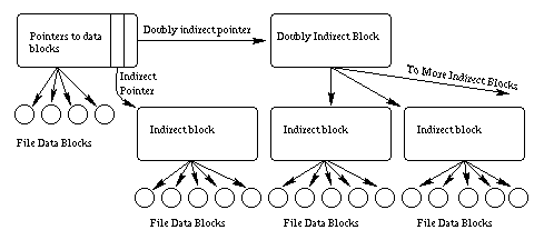 The first thirteen pointers point directly to blocks containing file data. If the file is thirteen or fewer blocks long, then the file's data is pointed to directly by pointers within each inode, and can be accessed quickly. The fourteenth pointer is called the indirect pointer, and points to a block of pointers, each one of which points to data on the disk. The fifteenth pointer is called the doubly indirect pointer, and points at a block containing many pointers to blocks each of which points at data on the disk. Perhaps the picture below will make things clear.
